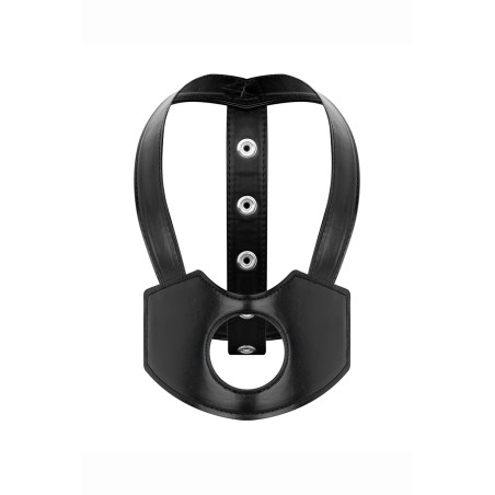 Ein Gesichts-Harness mit Halterung, um einen Dildo auf Kinnhöhe zu befestigen. Es schafft eine besondere Stimulation-Konfiguration, während der Mund für andere Dinge frei bleibt. Schwarzes veganes Kunstleder, verstellbar.