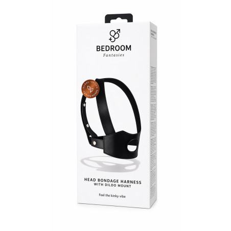 Das Head Bondage Harness von Bedroom Fantasies ist ein Gesichts-Harness mit Dildo-Halterung. Das Prinzip ist einfach: Ein Dildo wird über die vorgesehene Öffnung auf Kinnhöhe befestigt. Sobald das Toy montiert und das Harness richtig auf dem Kopf eingestellt ist, kann der Träger durch Kopfbewegungen die Aktion steuern, während der Mund frei zum Küssen, Lecken oder für andere Stimulationen bleibt.