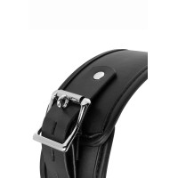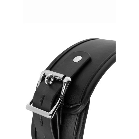 A restraint set that connects the wrists to the thighs — two thigh straps with integrated wrist cuffs. Soft inner padding for more comfortable wear. Black vegan faux leather, adjustable fit.