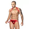An ultra-sexy set featuring a harness and jockstrap in metallic red with gold chain details.