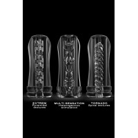 The three sleeves have different internal textures. The Black has beads, spirals and nubs. The White has alternating wide and narrow channels with beads. The Extrem has pyramids — it is the most intense of the three. The sleeves are interchangeable on the same case. If you are unsure and you like stronger sensations, start with the Extrem.
