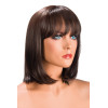 La perruque Camila de World Wigs est un carré long brun foncé avec une frange droite au-dessus des yeux. Les cheveux arrivent aux épaules avec des pointes légèrement effilées qui donnent du mouvement sans casser la structure du carré. C'est une coupe classique, intemporelle, qui fonctionne dans tous les contextes — soirée, club, sortie, ou jeux privés à la maison.