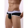 Jockstrap innovativo che combina uno stile slip davanti con una schiena aperta. Il suo design bicolore in nero e bianco, impreziosito da una fascia elastica a righe blu e bianca, offre un look sportivo, chic e sexy.
