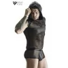 Afferma il tuo stile con audacia con la T-shirt con Cappuccio Wetlook e Mesh di Regnes Fetish Planet, un must-have per un look decisamente moderno e seducente.