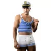 Met zijn blauwe gestreepte crop top, strakke witte short en marine-officierspet ben je klaar voor onvergetelijke avonden!