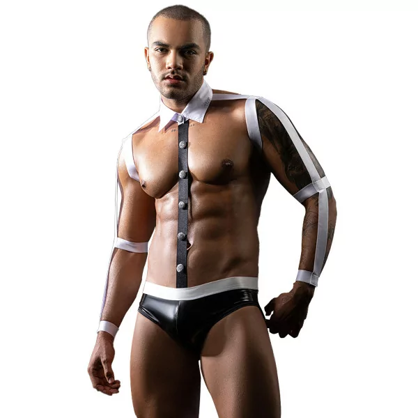 Dit kostuum herinterpreteert het klassieke oberuniform met een gedurfde en minimalistische stijl. Het shirt is gereduceerd tot een witte kraag, naden en knopenrij, waardoor een visueel verleidelijk effect ontstaat.